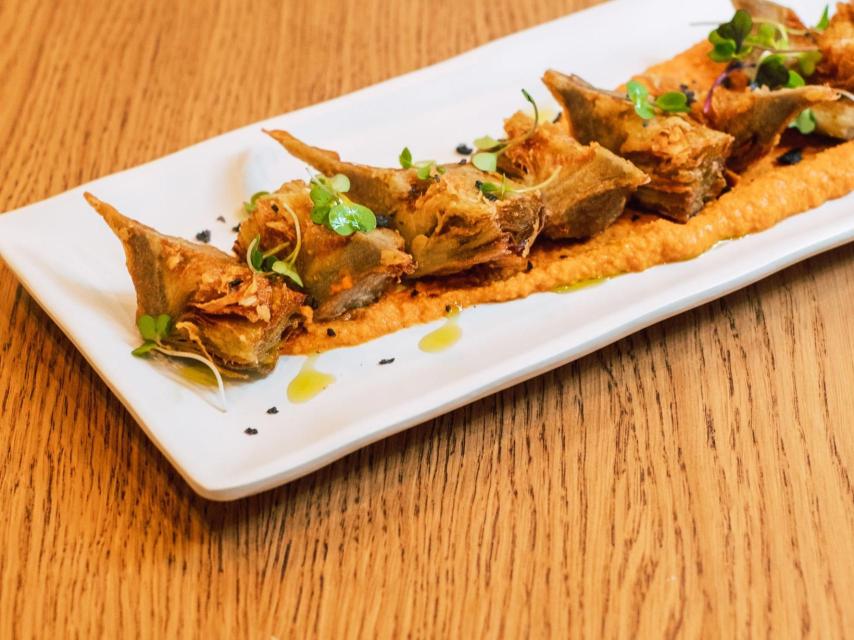 Entre sus entradas, hay platos muy castizos y de mercado, como unas bravas en gofre, que se presentan como una masa de patata, en la que en cada agujero del gofre, se inserta una salsa diferente: alioli, mayonesa de humo y tomate. También tienen croquetas de jamón, alcachofas con salsa romesco y foie en diferentes versiones, mi-cuit con confitura casera o a la plancha con crema de mango.
