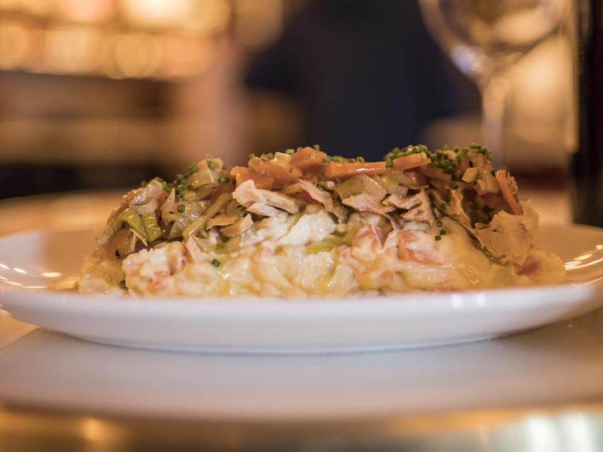 La ensaladilla rusa se puede tomar en versión clásica, con atún en escabeche casero o con una receta que mira al norte y rememora la formación del chef, con centollo del Cantábrico.