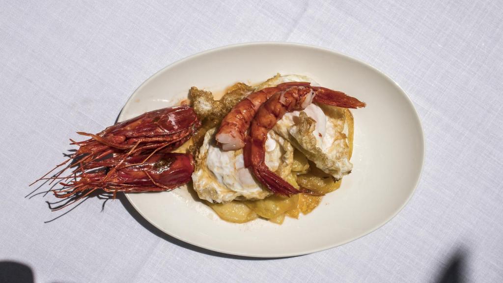 Otro de los platos más interesantes entre los principales, son sus huevos rotos con carabineros, que presentan con el cuerpo separado de la cabeza, para esta última bien esparcirla y mezclarla con todo y chuparla, al gusto del comensal. Una "idea tan sencilla y cojonuda", según el propio Salazar. Nunca fallan.