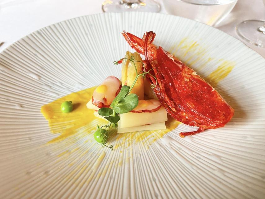 Nosotros tomamos el Menú Geisha de primavera, con 8 pases salados y un postre. Para abrir boca y preparar el estómago, nos ofrecieron alga wakame, que rápidamente dio paso al primer plato del menú, espárrago blanco de Navarra cocido, acompañado de carpaccio de carabinero y su cabeza, guisante lágrima y salsa Kimizu. Esta última se traduce del japonés literalmente por salsa amarilla, hecha con yema de huevo y vinagre.