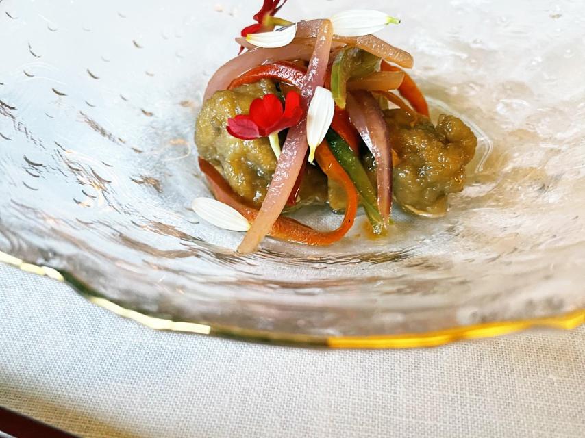A este espectacular comienzo, le sigue 'Tori No' Nanban Zuke de ave de corral con verduras en escabeche japonés. La propia Yoko Hasei explica los platos y sobre este apunta que es una forma de llamar 'al que viene del sur'. "En ese momento en el que arrancó la cocina kaiseki, en Japón había mucho comercio portugués e influencia de la cocina española. Como no tenemos vinagre de vino, utilizamos vinagre de arroz envejecido durante dos años para hacer el escabeche", relata.