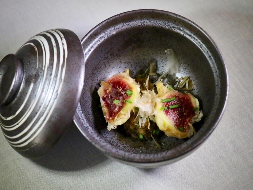 La experiencia continúa con un plato a base de cococha de merluza con setas enoki preparadas al vapor con sake y salsa Rikyu-an, que es el nombre que se le da al maestro de la ceremonia del té matcha, preparada con crema de sésamo, ponzu casero y zumo de yuzu.