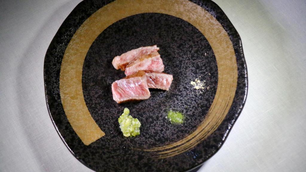 El pescado principal es un cabracho asado a la brasa de binchotán, con verduras de temporada como calabacín y una salsa de sisho muy equilibrada. El wagyu A5 hace acto de presencia procedente de Gunma, una zona montañosa de Japón con mucha fama en esta carne. Lo acompañan de verduras, mini zanahorias y maíz, con un toque de sal y kizami wasabi (fresco), que marida con la carne a la perfección.