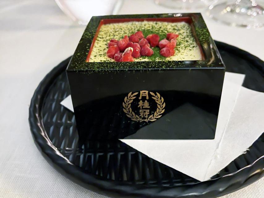 El postre es un delicioso tiramisú de té matcha. El bizcocho lo preparan con harina de arroz y lo coronan con frambuesa liofilizada y polvo de té matcha.