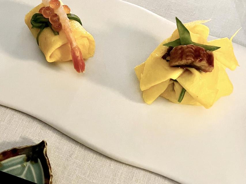 Yoko Hasei deja impronta de su procedencia, la prefectura de Gunma, muy cercana a Tokio, con el último de los pases salados. Se trata de un Chakin-Sushi, un sushi que hasta ahora desconocíamos. "Es muy típico de la cocina kaiseki, que de por sí es muy elaborada. El sushi para nosotros es casi comida rápida, pescado crudo y arroz. En cambio, este tipo -el chakin sushi- toma el nombre de envuelto en una toallita, como la que se utiliza para limpiar la taza en la ceremonia del té", relata Yoko. De esta forma, envuelven el sushi, en una especie de paquete hecho de huevo, que contiene en su interior arroz y verduras cocidas y que se corona, uno con gamba dulce e ikura y el otro con anguila. Como buena cena japonesa, siempre termina con una sopa miso que funciona a modo de digestivo.