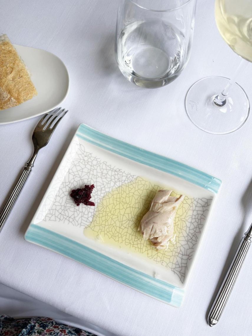 La comida o cena en todas las mesas, arranca con un aperitivo sello de la casa, unas lascas de ventresca de bonito que elaboran ellos mismos y que acompañan de cebolleta y riegan con AOVE. No puede haber mejor comienzo y declaración de intenciones.