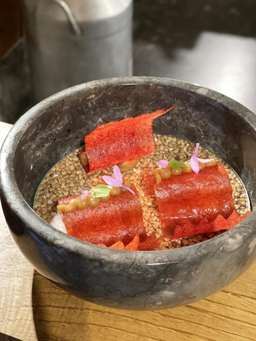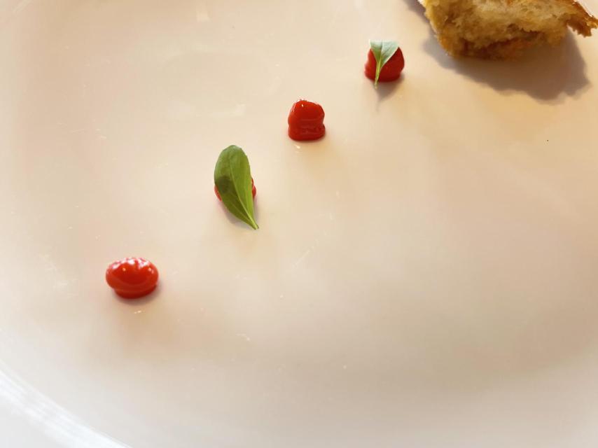 Y entonces arranca el menú Geroa y lo hace con una costumbre que todos conocemos, mojar pan. En este caso es con su Unte, un plato en el que viene un trozo de pan pamitxa mojado en caldo de carne, con el que rebañamos unos puntitos rojos, que son una emulsión de pimiento rojo. La sensación es como si rebañases el caldito que sueltan los pimientos con un pan delicioso.