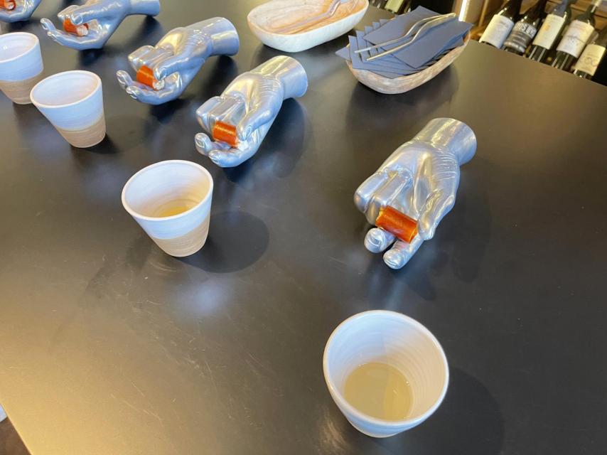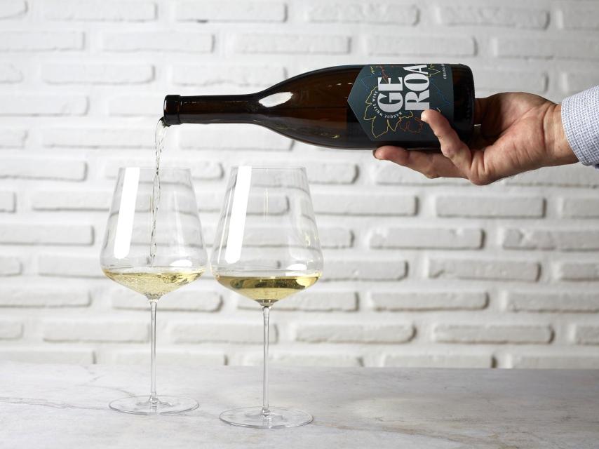 Nos esperan unas manos que nos ofrecen un cangrejo de río a la brasa, insertado dentro de un cilindro elaborado con una salsa vizcaína con un punto picante. Junto al bocado, un vaso de txacoli, y decimos un vaso y no copa, porque es de la forma que se bebía en casa. De hecho, la propia palabra txakoli deriva de 'hecho para casa'. El que sirven durante la comida viene de muy cerca, concretamente de esas viñas que divisamos desde el restaurante. En Dima poseen un viñedo de 11 hectáreas donde cultivan las variedades autóctonas hondarrabi zerratia y hondarrabi zuri con las que elaboran su txakoli propio, Garena y Geroa.