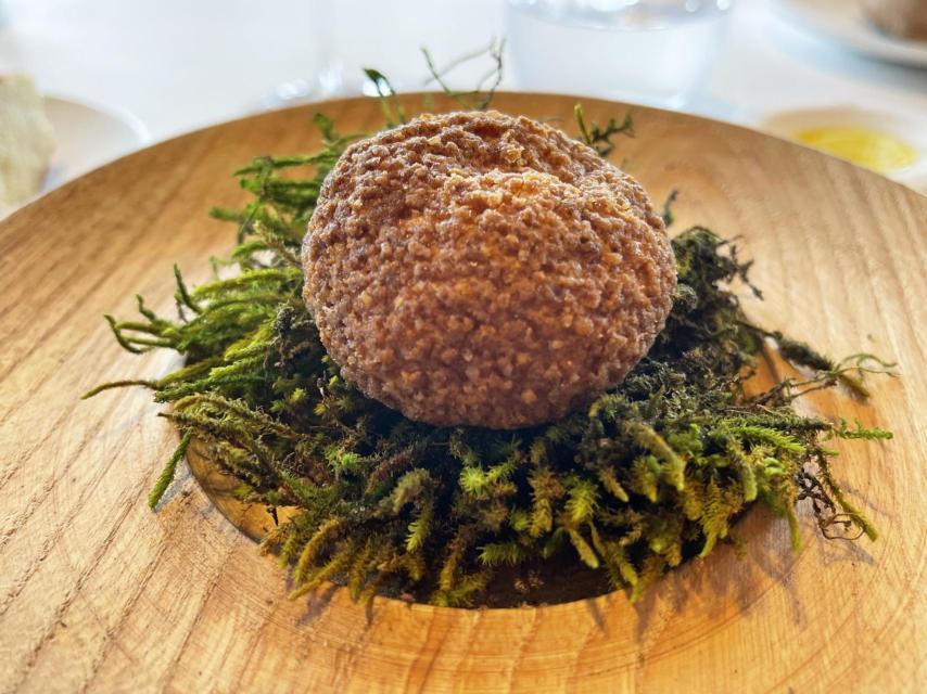 Le sigue un bollo que ha ido evolucionando, primero fue un cucurucho y ahora es un bocado de pasta choux relleno de steak tartar de vaca Betizu. Nos cuentan que antiguamente era el ganado mayor que pastaba por estos montes. Al tiempo ese ganado tuvo que volver a la cuadra, pero estos animales nunca se acostumbraron a estar encerradas. De hecho, de ahí le viene el nombre, que significa ‘vaca asustadiza’. A los ganaderos les costaba tanto sacarla adelante, que casi se pierde la raza. Ahora se está recuperando y ya se cuenta con unas 900 cabezas de ganado y en la línea del restaurante, los apoyan con este plato.