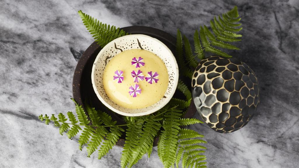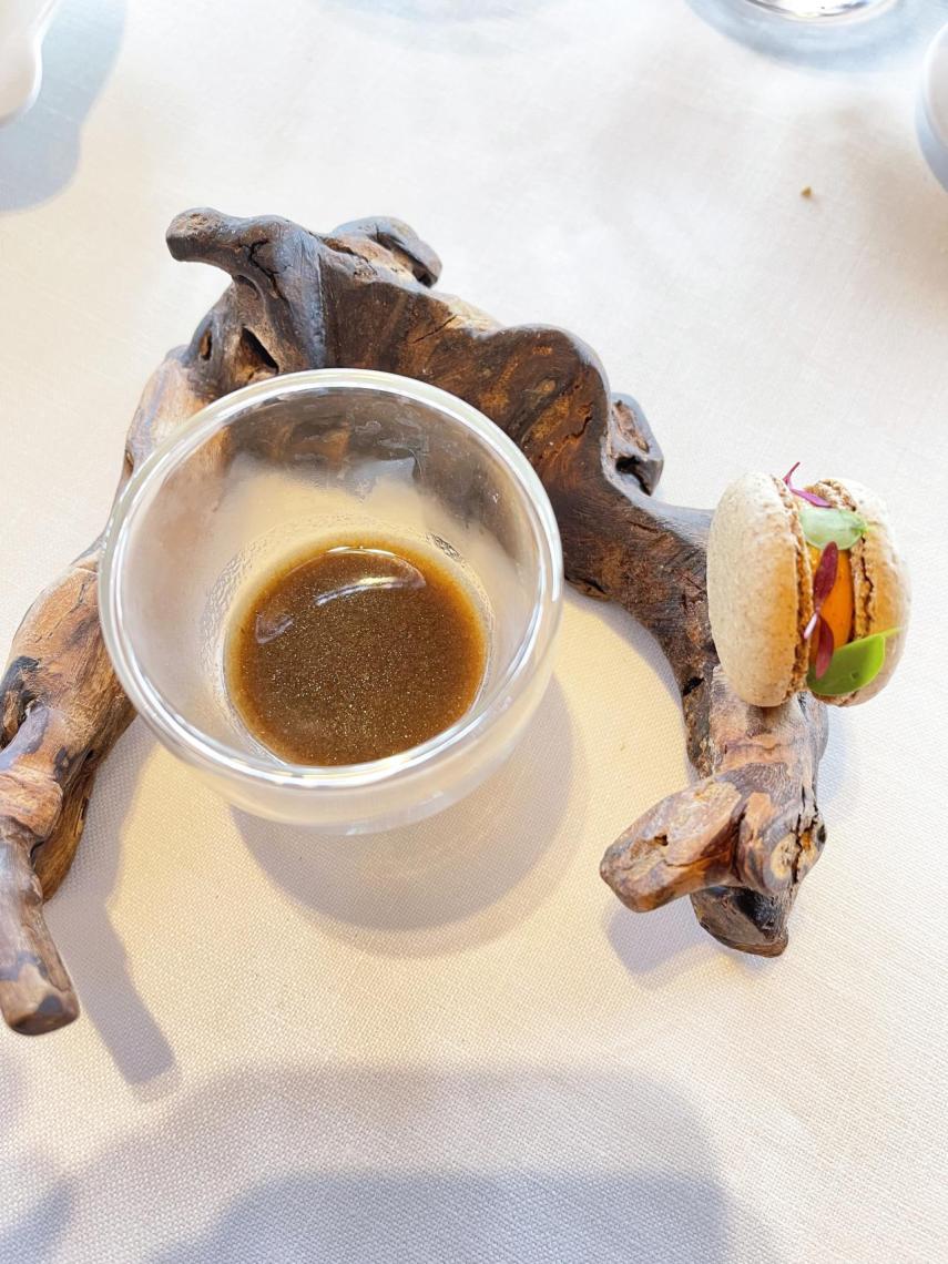 Seguimos el menú en Garena con unas babatxikis, un tipo de legumbre que en su día dio de comer a muchas familias. Las más apreciadas eran las negras, pero también cuentan con una variedad blanca. “Se han ido poco a poco perdiendo, pero una mujer de Arbizu (Navarra) nos las manda directamente de allá, de su caserío y reinterpretamos su receta”, explican. En su versión, lo presentan como un caldo, con potencia de sabor a las babatxikis, acompañado de un macaron hecho con harina de bellota, que rellenan con una mantequilla de chorizo casero.