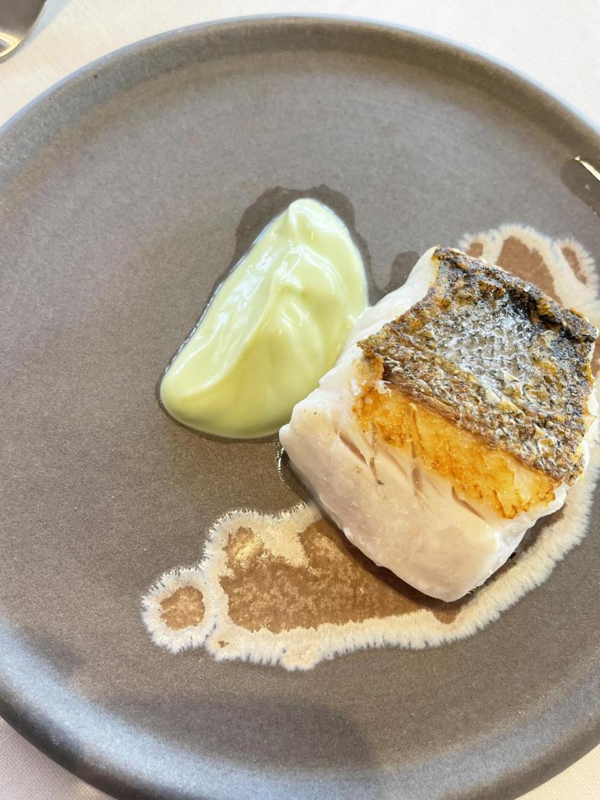 Tras esta transición, damos paso al pescado. En esta ocasión es una fresquísima merluza del puerto de Ondarroa, que en su día era el pescado más apreciado en los caseríos pero que pocas veces llegaba a las casas. Unas, el pescado en sí era malo, otras, estaba algo pasado y así inventaron la salsa verde, para enmascarar su sabor. Aquí efectivamente la merluza es de altísima calidad y se acompaña con una salsa verde de vainas.