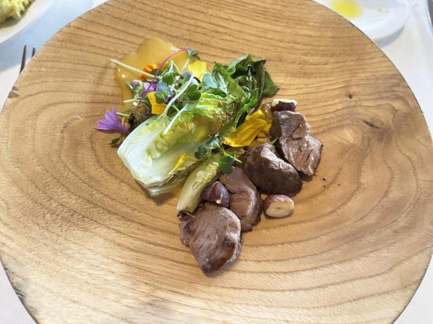 El siguiente plato era un mar y montaña perfectamente ejecutado, una papada ibérica de una raza autóctona que están recuperando en Lekunberri y una cigala. Pero lo realmente importante aquí es algo que casi puede pasar desapercibido, la arbigara. Se trata del cogollo del nabo, un producto muy difícil de encontrar, pero que tienen la suerte de que uno de sus agricultores de confianza les provee desde su caserío. Se utiliza poco en la cocina, pero aquí le han sabido sacar provecho escaldándolo dos veces, quitándole el amargor que lo caracteriza. El sabor es de esos que perduran.