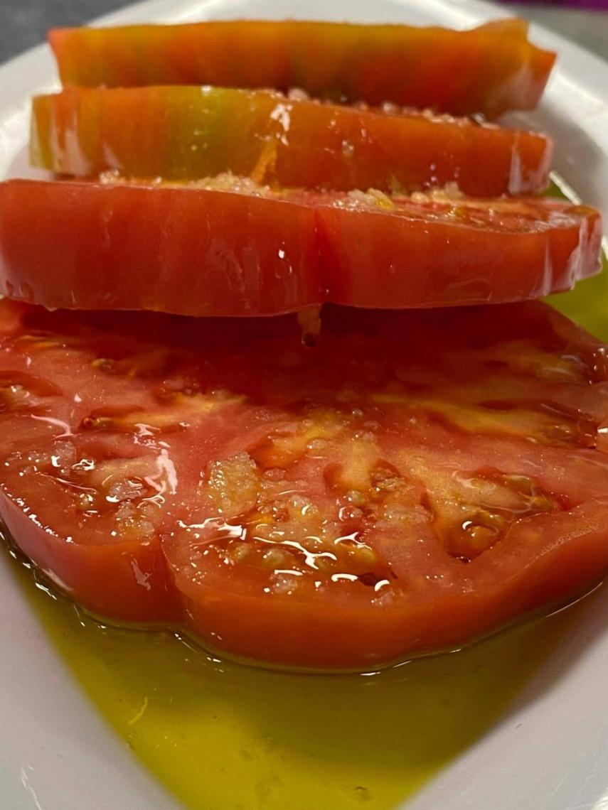 ¿Qué nos encontraremos en estas jornadas? Lo primero, sus tomates, de color rojo oscuro e intenso sabor, que se presentan al natural con AOVE como aderezo. Continúan este menú degustación (42,90 €) con un lomo de sardina sobre una tostada de pan con tomate y un tomate con burrata o ventresca de bonito del Norte.