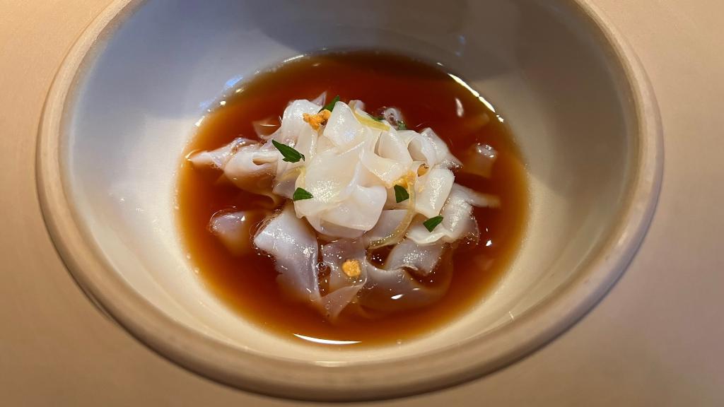 El ejemplo perfecto son los tallarines de calamar con caldo de chipirón. Bajo solo dos elementos nos encontramos un plato lleno de complejidad, en el que el trabajo del fondo (en este caso de chipirón) es lo realmente importante, llenando de profundidad y sabores cada cucharada que nos llevamos a la boca. Textura del calamar y sabor del caldo, sencillez que produce el máximo placer.
