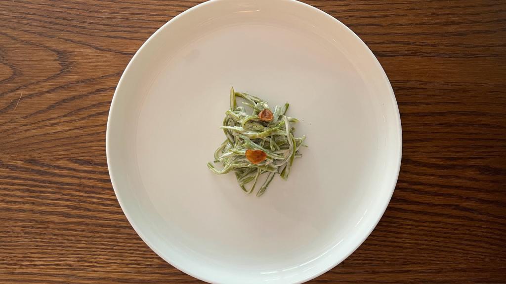 Las judías verdes con jamón es uno de los mejores platos que elaboran, presente ahora por ser de temporada. Un corte maravilloso de la judía con una crema de jamón ligada con nata, un resultado fantástico que recuerda a un plato tan típico y tradicional, pero con una vuelta de tuerca muy interesante.