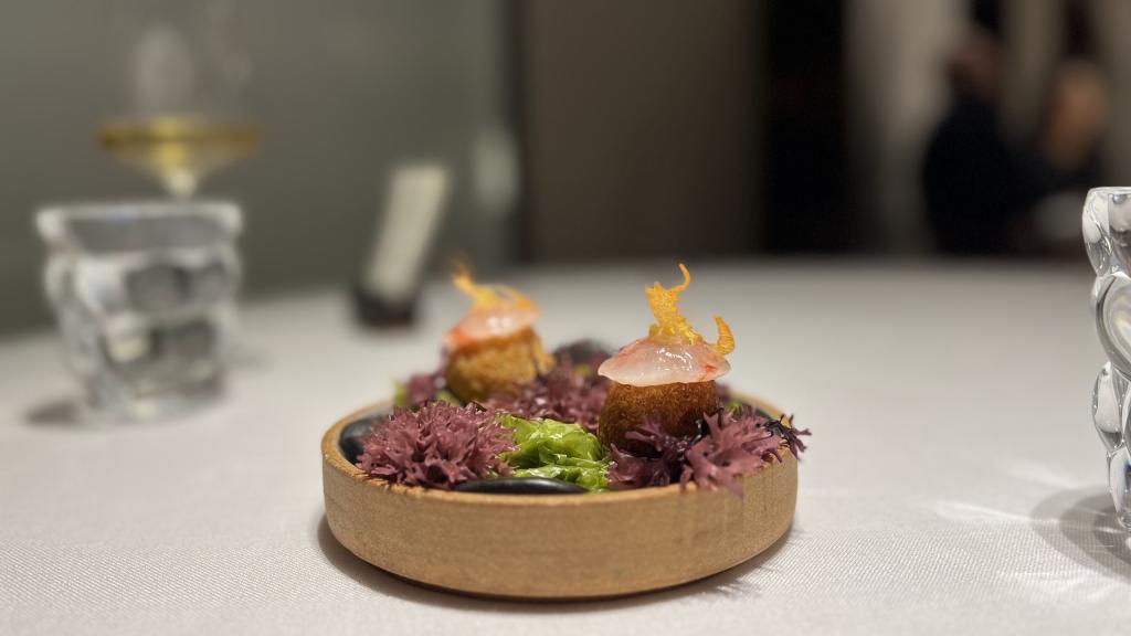 Durante este viaje encontraremos grandes platos como la croqueta de gamba de Palamós, un puerto conocido por la excelente calidad sus gambas debido a la profundidad de sus aguas, que permite conservar la textura y sabor. La croqueta se sirve con la cola de la gamba curada durante 30 minutos en algas. Sobresaliente.