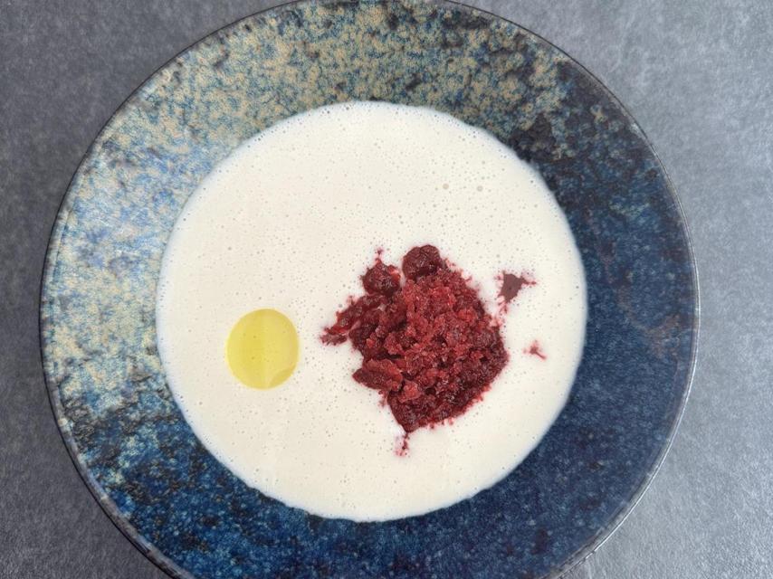A partir de ahí, disfrutamos de platos minimalistas, pero llenos de sabor y reflexión. Un ejemplo es su ajoblanco, que en lugar de almendra, utiliza chufa, un ingrediente muy valenciano. Este plato se acompaña de un granizado de cereza y arenque ahumado, una combinación que sorprende desde el primer bocado.