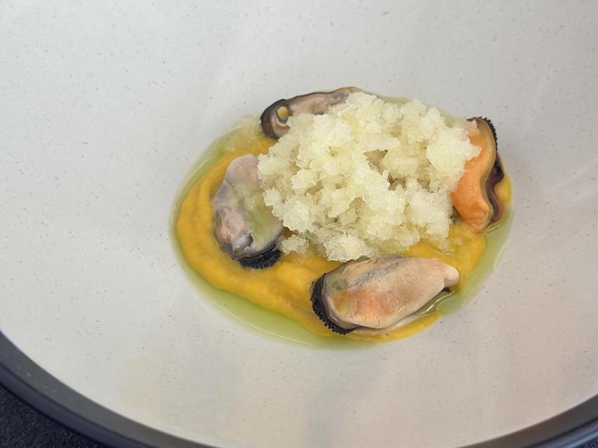 El festín continúa con creaciones como un gazpachuelo de pimientos verdes fritos, caballa y palomitas de corteza de cerdo, o la clóchina valenciana al vapor, que se fusiona a la perfección con una base de escabeche de zanahorias, aceite de albahaca y un sorprendente granizado de piña.