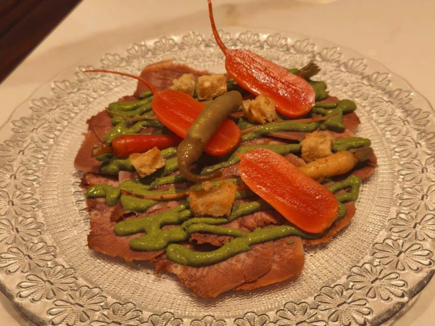 "Hemos elaborado un menú de bocados clásicos y sabores fácilmente reconocibles", explica Cavazzoni. "En algunos platos he querido rendir homenaje a mi cultura italiana, combinando ingredientes de forma sutil y equilibrada, como en la tapa de presa ibérica 'tonnata', las alcachofas 'cacio e pepe' o los raviolis 'plin' de ossobuco.