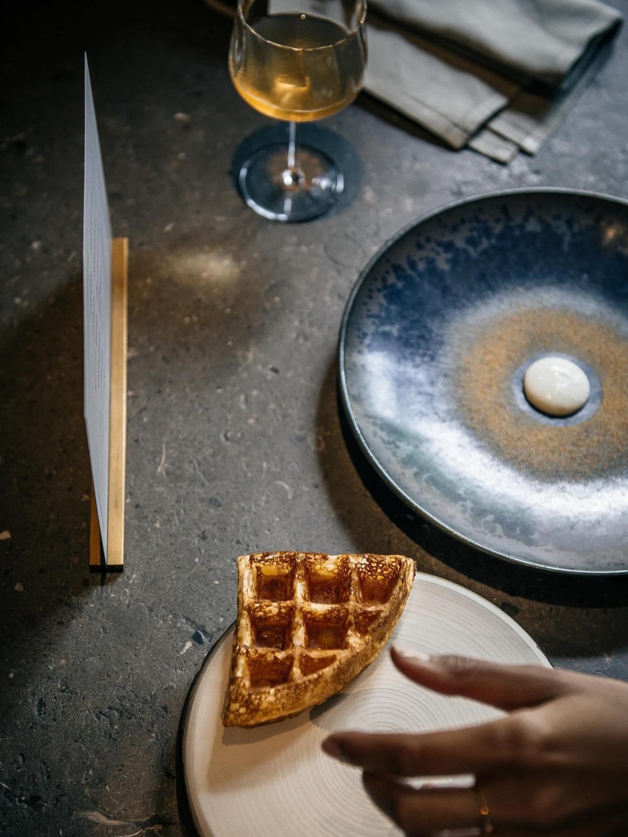 Aunque no es un restaurante con platos signature, hay algunos que son los más laureados. Uno es su Raclette Waffle. Cuando te lo ponen delante, parece un gofre dulce, pero en realidad es una explosión de umami increíble gracias a la combinación de kimchi, yogur y queso suizo. "Este pase es un recuerdo a nuestras cenas del 24 de diciembre, que en Suiza, tradicionalmente, se come raclette", explica el chef. La idea es comerlo con las manos y mojar en el polvo de kimchi y el yogur. Para repetir y repetir.