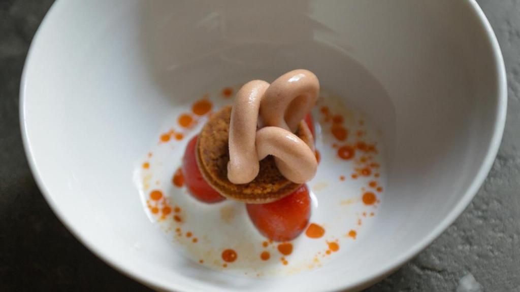 A partir de aquí, juega con los ingredientes y sus preparaciones. Como con el plato que recibe el nombre de berenjena. Bien podría ser una tartaleta con diferentes capas de mousse, pero lo que realmente es es una galleta sobre la que se asienta un confit de berenjena, una crema de nueces pecana y mermelada de manzana, y en la parte superior, un crujiente de berenjena. Por su parte, el plato Tomato es otra muestra de su ingenio. Aquí, el tomate se presenta en tres formas distintas: confitado, caramelizado y en helado. Pero lo más sorprendente es que lo acompaña con sobrasada, aportando un contraste salado y ligeramente picante. "Se trata de extraer la esencia del ingrediente y llevarlo más allá de su propósito original", explica.