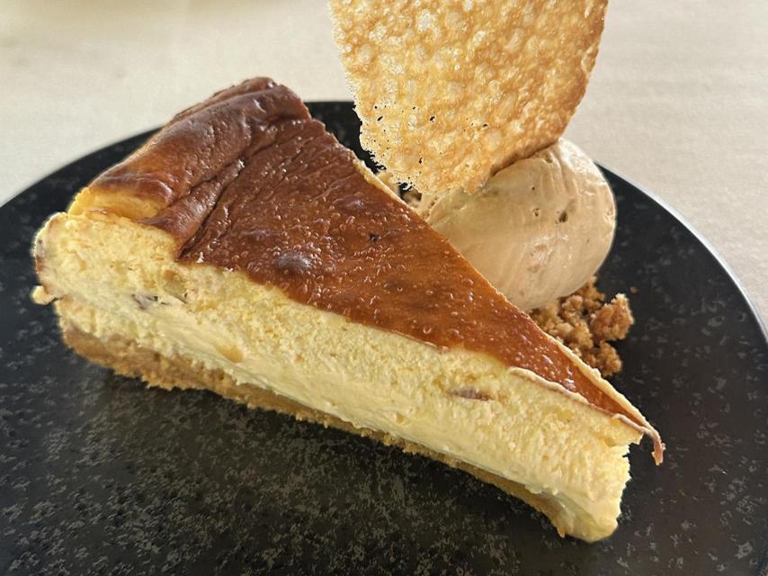 Hay que dejar hueco para el postre. La quesada a la antigua, con cremoso de mantequilla tostada, es untuosa y tiene un twist: mantecado de vacuno. La carne se cuela hasta en los dulces. La tarta de quesuco de Cantabria es cremosa, sin desparramarse, servida con helado de galleta Chiquilín.