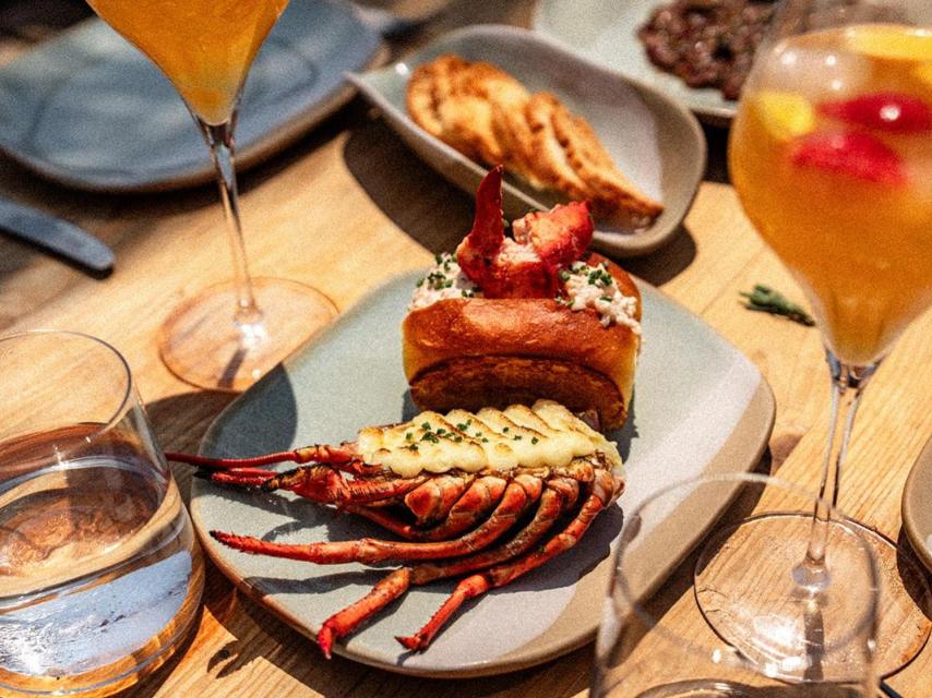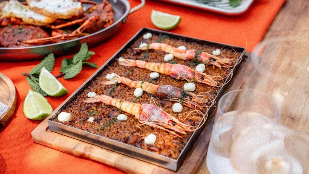 Entre los principales, a los que han llamado headliners, hay pescado del día que preparan a la brasa con agua de Lourdes, chuleta madurada de vaca gallega de pasto, un par de arroces en llanda -de gamba roja y de black angus- y la langosta ibicenca con patatas y huevos.