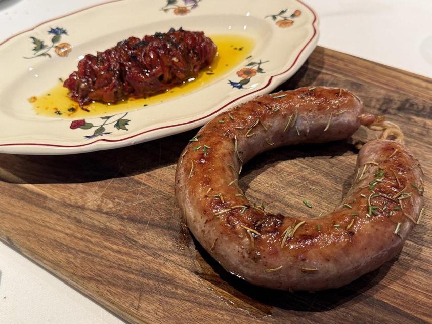 Entre los entrantes no faltan otros productos con nombre y apellido. La txistorra "de mis tíos", la cabeza de cerdo de Astorga... Otro imprescindible es el salchichón fresco asado con romero, traído de La Rioja y servido como si fuera una butifarra, acompañado de pimientos del cristal navarros asados a la leña. "No les hacemos mucho más", dice Pilar. Buen producto, punto justo y poco más.