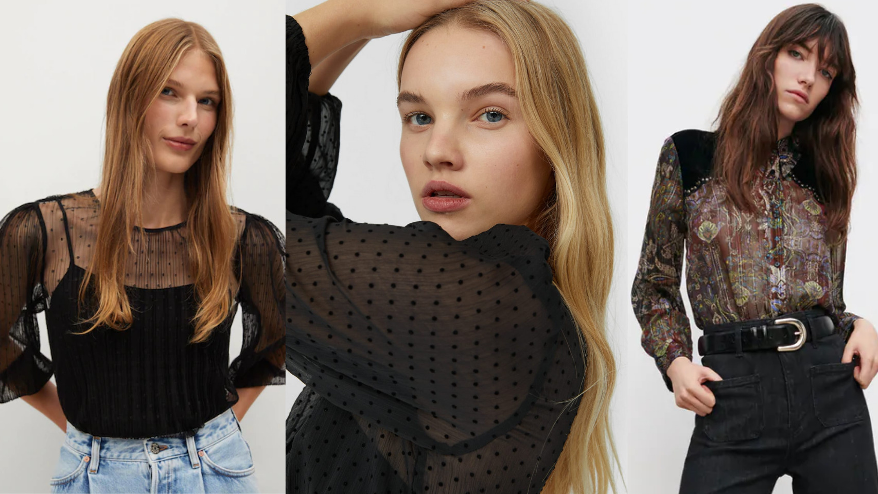 En la nueva colección de Zara, destaca esta blusa semitransparente de cuello con solapas y mangas largas acabada en puño de tejido combinado en terciopelo con aplicación de tachas y detalle en hilo. Su estampado aportará un toque vintage a todos los estilismos de la temporada.