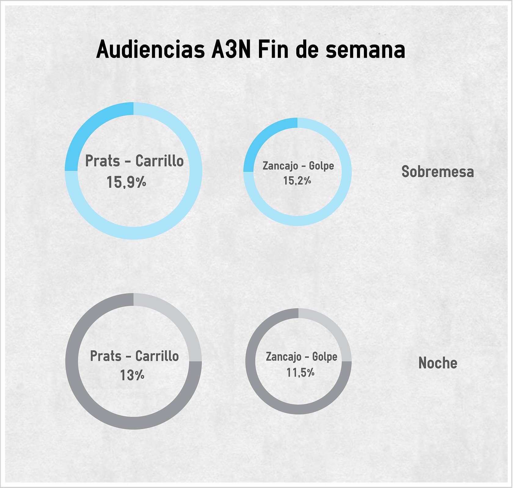 Ambos se movían en septiembre desde el informativo nocturno diario hasta las dos ediciones de sábado y domingo de este noticiero. Tras varios años en que no lograban alcanzar a Pedro Piqueras, Atresmedia decidió colocar a Álvaro Zancajo y Sandra Golpe en esta franja e intercambiar su puesto con Prats y Carrillo.