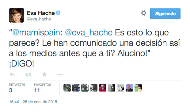 Esta información le llega a Eva Hache, que hasta ese momento desconocía la verdadera situación que habría creado su fichaje por Cuatro, a través de uno de sus seguidores en Twitter. Ella misma pregunta a este portal por las fuentes que citábamos en nuestra noticia.