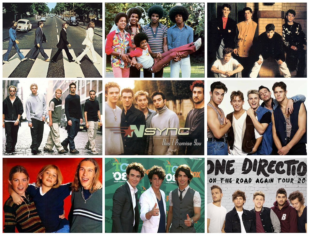 En la imagen, por orden histórico: The Beatles (los 60), Jackson 5 (los 70), New Kids on the Block (los 80), Backstreet Boys (los 90), N’Sync (los 90), Take That (90), Hanson (90), Jonas Brothers (2000) y One Direction (2010).