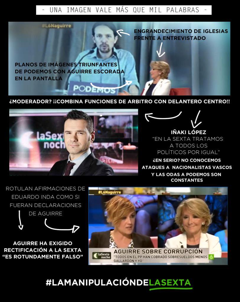 "Rotulan informaciones de Eduardo Inda como si fueran declaraciones de Aguirre", aseguran ahora. "Aguirre ha exigido rectificación a laSexta: Es rotundamente falso". Tras acusarles de mentir, esta afirmación fue desmontada por Cristina Pardo en Al rojo vivo, que le hizo un triple fact check a la candidata.