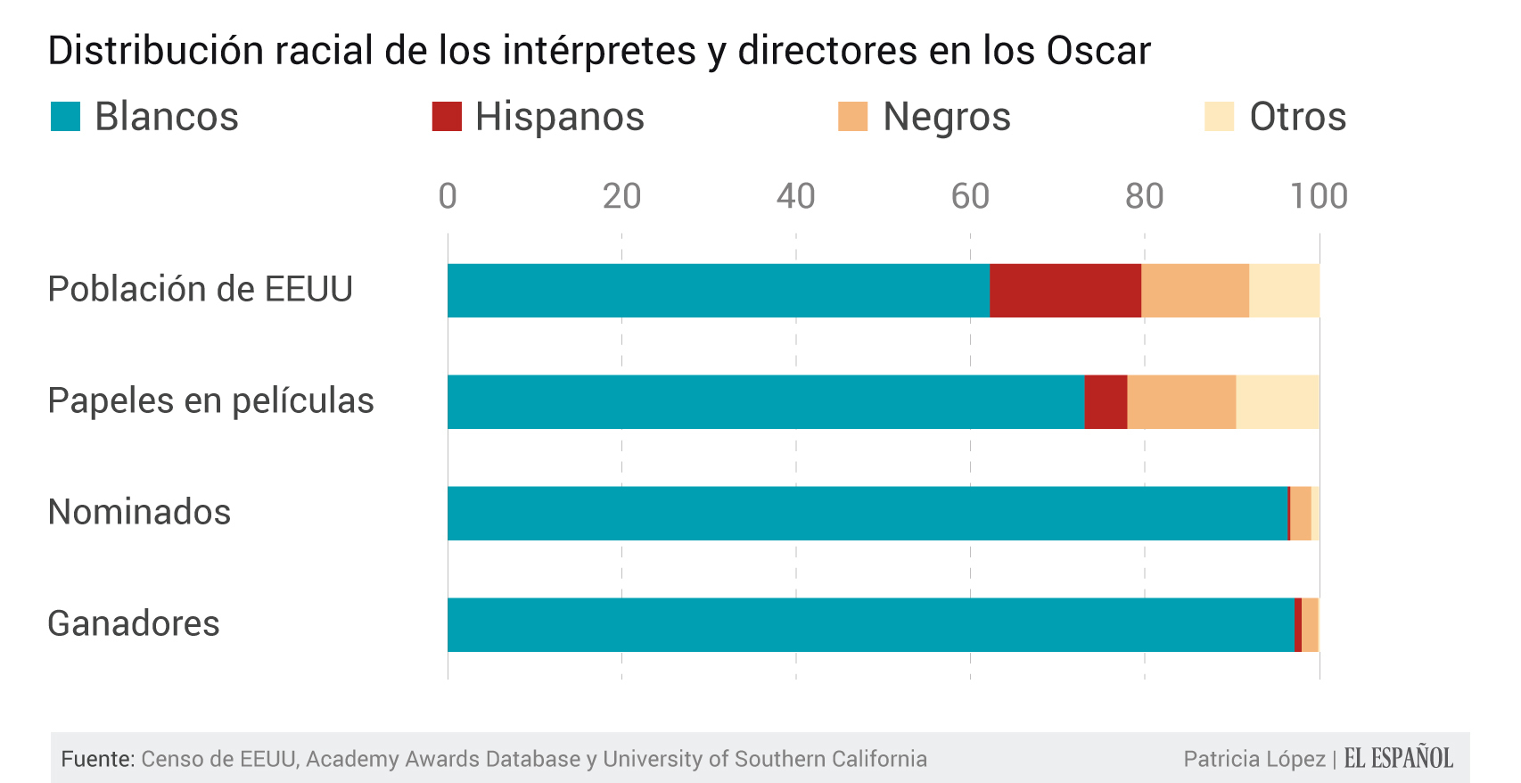 No se trata tanto de las nominaciones, sino del reparto de las películas. Un estudio de la University of Southern California revela que el 73,1% de los actores que interpretaron un papel en 2014 son de raza blanca. Tan solo el 12,5% son afroamericanos. Los investigadores afirman que estas cifras no han variado, al menos, desde el 2007.