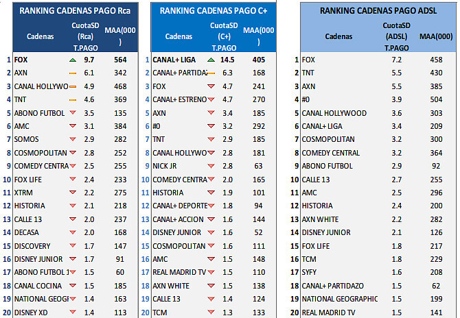 Precisamente Fox esla cadena líder en el resto de medidores. En el conjunto denominado como "resto" obtiene una holgada primera posición seguida de lejos por AXN, que es segunda. En la clasificación de plataformas de ADSL también lidera aunque en este caso la segunda posición es para TNT.