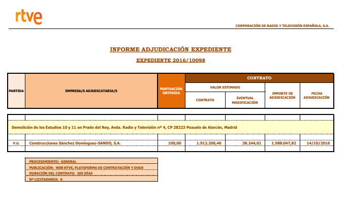 El pasado mes de mayo, TVE anunciaba la demolición de los estudios 10 y 11 de Prado del Rey para iniciar una nueva fase de construcción y así mejorar la capacidad de producción de la televisión pública. La Corporación le confiaba la esta tarea a Construcciones Sánchez Domínguez-Sando, una decisión que recayó en manos del Consejo de Administración. Al frente de esta empresa figura José Luis Sánchez Domínguez, que aparece en la contabilidad B del ex tesorero del PP, Luis Bárcenas, como uno de los supuestos donantes de los populares en Andalucía.
