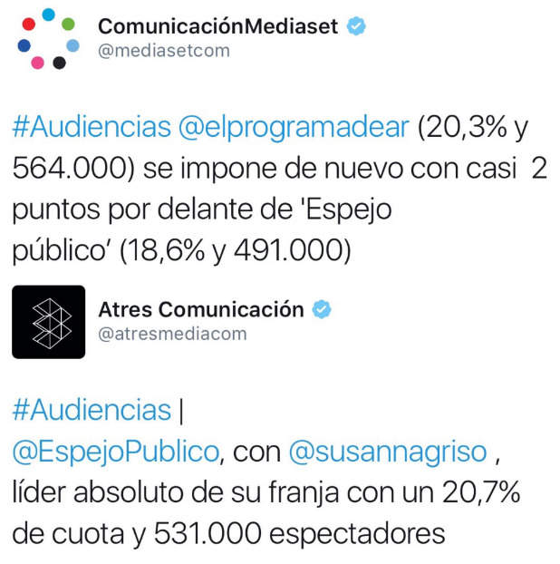Pero los datos hablan por sí solos: desde el pasado 5 de septiembre, día en el que Susanna Griso se incorporó al programa, Espejo público ha ganado un día de las 29 emisiones si tenemos en cuenta la franja de coincidencia de 9:00 a 12:20 horas. Si, como piden desde Antena 3, se comparase sólo de 9:00 a 11:45 horas, el programa de Griso sigue sin adelantar a su competencia y gana nueve de las 29 emisiones.