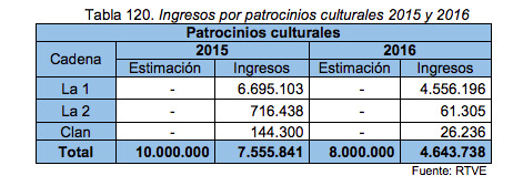 ¿Cuánto ingresa RTVE en patrocinios culturales y deportivos?