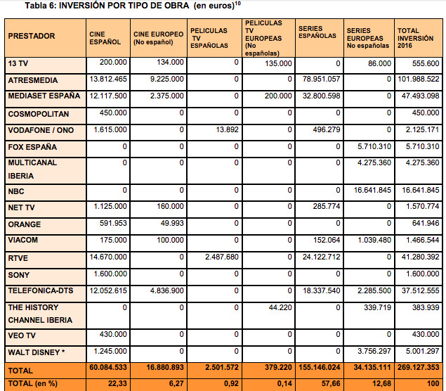Según el informe, los prestadores del servicio de comunicación audiovisual a nivel nacional inviertieron a lo largo de 2016 un total de 269,12 millones de euros en obra audiovisual europea, lo que supone un aumento del 49,56% con respecto al ejercicio anterior (179,93 millones de euros).