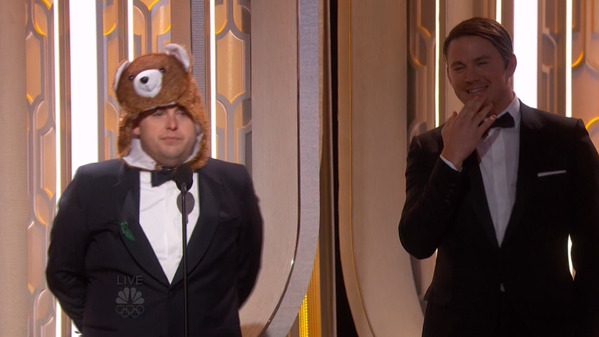 Channing Tatum y Jonah Hill, disfrazado de oso, han salido a presentar el primer premio de la noche a Mejor actriz de reparto que se ha llevado Kate Winslet por su papel en Steve Jobs. Su discurso ha sido de agradecimiento por el gran año que han tenido las mujeres en el cine, nombrando tanto a Danny Boyle como a Michael Fassbender, director y protagonista de la película respectivamente.