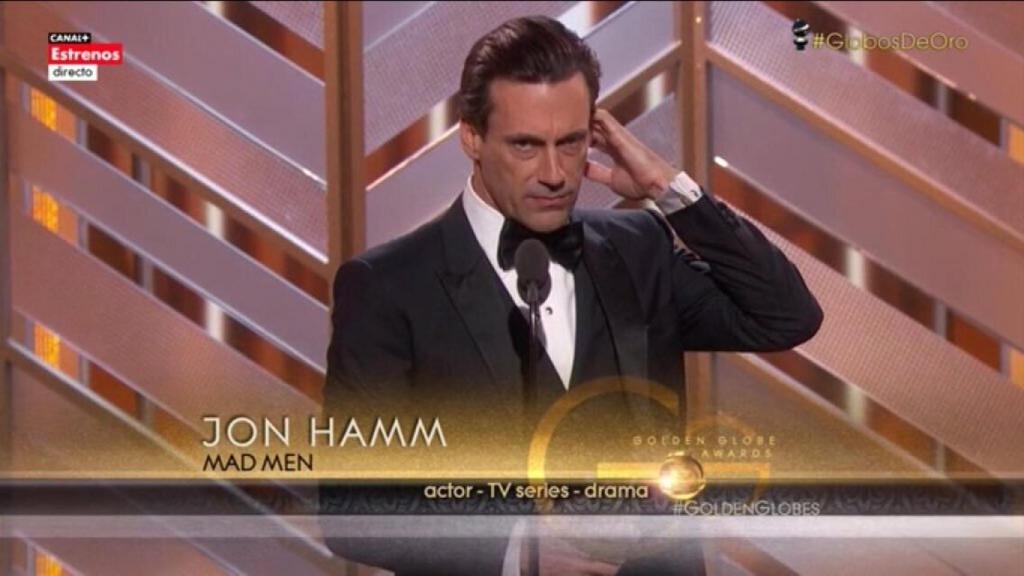 Eva Longoria ha entrado en escena con America Ferrera ante chistes dirigidos hacia Donald Trump. Ellas han sido las encargadas de darle su segundo Globo de Oro a Jon Hamm, que acaba de despedir Mad Men y lo hace por todo lo alto. Ya se llevó el Emmy por estos últimos capítulos en septiembre. Le ha quitado el premio a Rami Malek, favorito en la categoria por Mr. Robot.