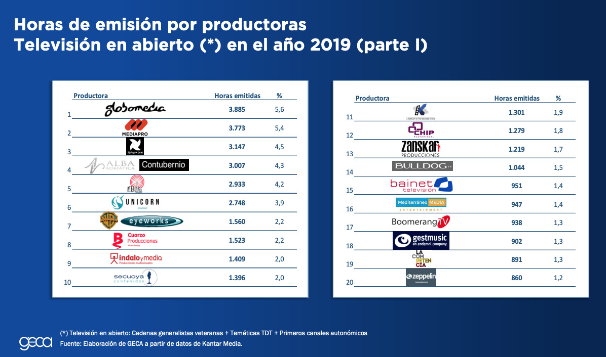 Por cadenas, las productoras favoritas de Telecinco son La Fábrica de la Tele con 1.509 horas, Unicorn Content con 1.507 horas, Fremantle (Got Talent, Me quedo contigo) con 582 horas, Cuarzo Producciones con 492 horas y Zeppelin (GH VIP, GH DÚO) con 379 horas.