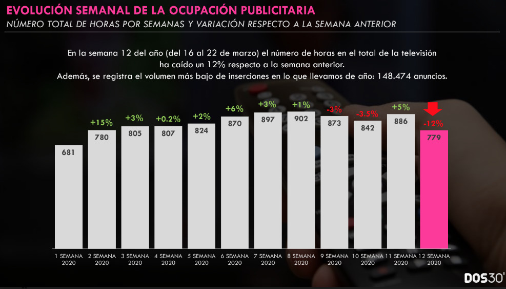 Un informe de Dos30' nos ayuda a desgranar cuál está siendo el comportamiento de la publicidad en la televisión. ¿Cuánto está bajando, la ocupación publicitaria? ¿Cuáles son los sectores publicitarios que se están viendo más afectados por la crisis delcoronavirus? ¿Ha crecido el volumen de GRPs?