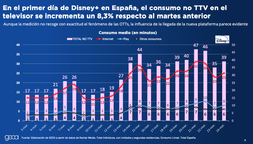 Pero, volviendo a los datos del impacto de Disney + en el consumo, tal y como explica la consultora GECA en su informe, estos registros no recogen con exactitud el fenómeno de las OTTs. ¿Por qué? Dentro del dato INTERNET se recoge el consumo realizado a través del televisor de plataformas OTTs como HBO, Movistar, Netflix o Amazon, pero también de YouTube o cualquier otro que no se haya recogido en diferido.