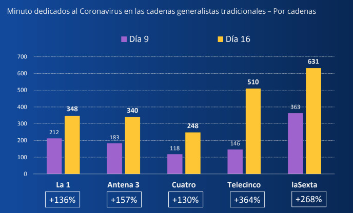 Según un informe de la consultora GECA, en el que se analiza la diferencia entre el tiempo total dedicado a hablar sobre el virus el pasado día 16 con respecto al dedicado hace una semana, el lunes 9, en total se dedicaron 2.077 minutos a tratar este tema teniendo en cuenta programas informativos y no informativos. Supone el doble que hace una semana, cuando se dedicaron 1.022 minutos.