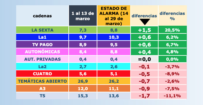 Esto ha hecho que la diferencia entre Mediaset España y Atresmedia se haya recudido en marzo hasta las cinco décimas (27,3% vs. 26,8%) después de que, desde el 13 de marzo, el grupo de San Sebastián de los Reyes (26,9%) haya sido líder por siete décimas(26,2%) ya que ganó 0,5 puntos durante el confinamiento y por la perdida de 3,1 puntos de su rival.