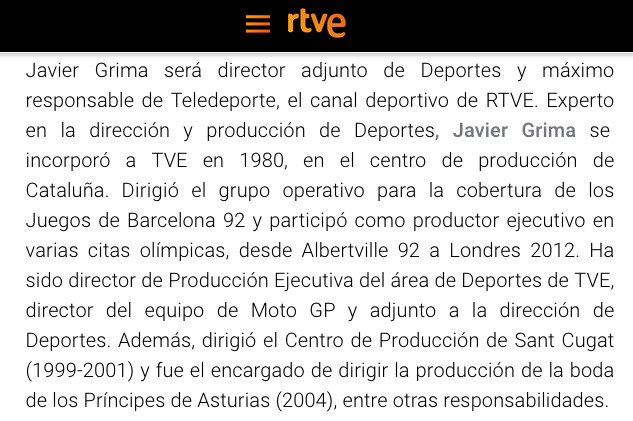 Sin embargo, en la nota de prensa que se mandó a los medios se obvió que Grima, quién se incorporó a TVE en 1980 y fue director de Producción Ejecutiva del área de Deportes de TVE y director del equipo de Moto GP, había pedido una excedencia en 2014 para trabajar en la empresa privada, concretamente en Movistar, World Roller Games y DAZN, entre otros.