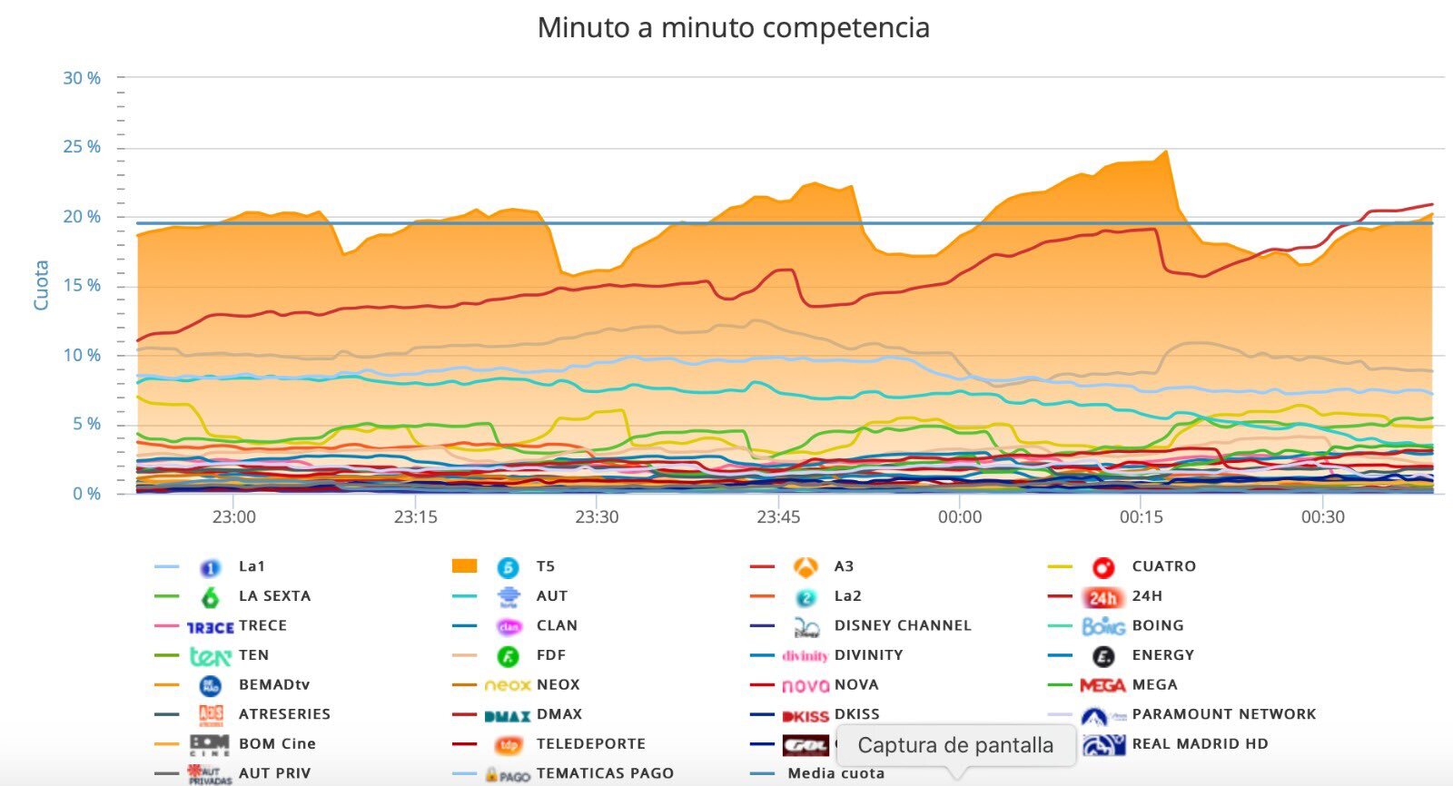 En estricta coincidencia con Mujer, de 23:00 a 0:40 horas, Telecinco anotó un 19,5% y 2.366.000 espectadores por el 15,4% y 1.860.000 espectadores de Antena 3.