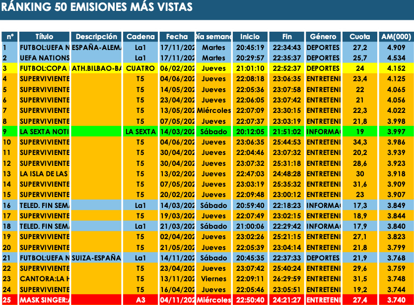 El deporte permanece en los primeros puestos del ranking. Sin embargo, si en 2019 la tabla estaba encabezada por la ‘Copa del Rey’ y la clasificación de la ‘Eurocopa’, este año el techo lo marca la ‘UEFA Nations League’ (3.622.000 y 23,3%) en La 1, una de las pocas competiciones todavía con derechos de emisión en abierto.