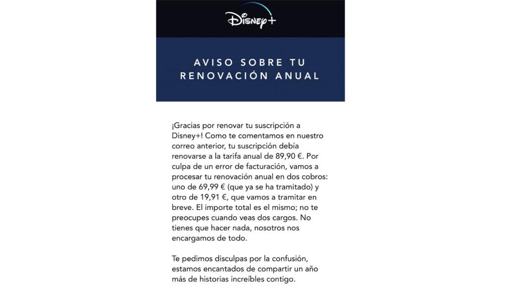 “Por culpa de un error de facturación, vamos a procesar tu renovación anual en dos cobros: uno de 69,99€ y otro de 19,91€ […] El importe total es el mismo; no tienes que hacer nada, nosotros nos encargamos de todo.”